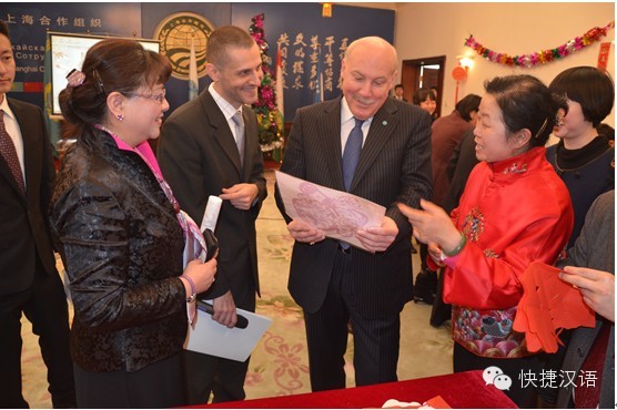 11点整,秘书长率领秘书处的工作人员和快捷汉语的老师们迎来了上合各成员国驻京的外交官们,共同参与和体验了带有浓郁中国传统文化色彩的欢庆活动。
